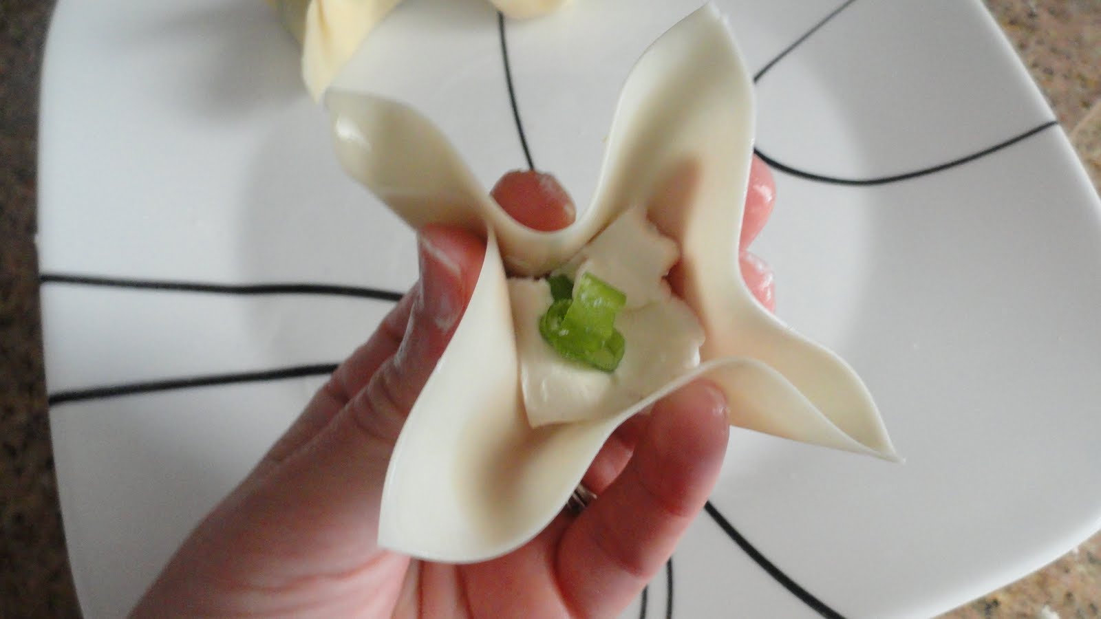 For those that don't like the idea of deep frying your whole meal- these can be baked, although the are much better all crispy and fried. If you want to bake them, place wonton wrappers in muffin cups. Stir the cream cheese and green onions together and put little dollops (I've always wanted to use that word) into the wonton wrappers. Bake at 375 for 8-10 minutes. Keep on eye on them. Once their edges are lightly browned, they're done! there. See? A kinda healthy version. :D